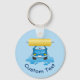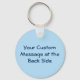 Smiling blue cartoon car washing under carwash brush. Custom background colour. Custom text on both sides.