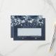 A navy wedding RSVP enclosure card featuring a navy blue watercolor painted background with watercolor painted florals in navy and dusty blue, stating RSVP in large upper case serif letters with your reply by date underneath and a large light grey area for guests to write their names with a box asking for the number of guests to be written asking to joyfully accept or regretfully decline. Your names and numerical date are written on the back of this RSVP enclosure card.