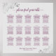 This wedding seating chart includes table assignments for 150 guests at 15 tables. The design is simple yet elegant featuring magenta or cassis purple text on a gray background. The title is written in lacy script calligraphy and there are silver faux foil frilly floral decorations in the corners. Stylish, chic and sophisticated way to help your guests find their seats at your reception.