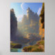 High above the river, upon a hill stands an awe-inspiring sight; a massive castle that seems to reach the sky. Its magnificent structure dominates the view, casting a shadow upon the small town that rests beside the river's edge. The attention to detail and the use of light within this digital art piece brings to life the grandeur of the castle's architecture and the charming serenity of the town below.