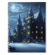 Notebook of a dark gothic castle nestled between ancient trees and the mountain ranges behind. Above, the silver Moon shines through the clouds and snowflakes casting her glow over a peaceful wintry scene, an outside peace which belies the torment of the lord of the castle. Night after night he spends the days among his tomes remembering what was and what could have been. From the four corners of the land he has received the visit of a proud crow, a wise owl, a fearless dove, and the beautiful swan, but he needed nothing they could give for in his hollow heart only resided the hope of his desire, and the truth of his life was the eternal waiting for the wish to become reality. This artwork of snow and hollow hearts was generated in Leonardo.ai and then altered by me.