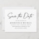 Simple save the date card featuring "Save the Date" in a black handwritten script with a white background. Personalise the modern save the date card by adding your names, wedding date, wedding location, wedding website, etc. The minimalist save the date card reverses to display a solid black background with space for additional text and photos.