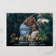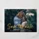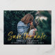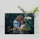 A modern save the date card featuring "save the date" in a fresh and casual handwritten typography style that evokes the look of a brush marker. Designed to accommodate your favourite horizontal or landscape orientated full-bleed engagement photo, this chic card features a white text overlay with your names, wedding date and wedding location, and "save the date" in gold foil lettering. Cards reverse to a subtle ikat pattern with space to include your wedding website url or any additional information you choose.
