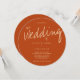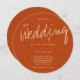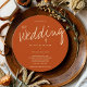 A circular wedding invitation with a casual, yet modern, typography design. This burnt orange solid colour invitation accents the big event with the word Wedding in a large, handwriting-style, font. The rest of the invitation is in clean, open, typography that gives the design a strong structure. This invitation reflects the relaxed, yet well-organised, nature of your wedding. Ready to check invitations off your list? Simply add your information, add this invite to your cart, and have a great wedding.