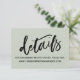 Keep your wedding guests in the loop with all your details using these pretty, modern wedding insert cards. A casual text overlay was designed using a casual handwritten font in black, simply reading "details". Use the template fields to customise these enclosure cards with your personal information. The background colour can be changed to anything from your wedding palette that you choose; all editable text appears in black. // 100 //