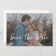 A modern and casual save the date announcement with your favourite horizontal/landscape photo overlaid with "save the date" in modern white casual handwritten font. The colour of this is editable. Personalise further by add details of your wedding website with a QR code on the reverse.