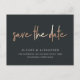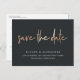 A modern save the date postcard with "save the date" in faux copper foil handwritten lettering on a rich, soft black background. Personalize with your names, wedding date and wedding location beneath in white lettering.