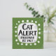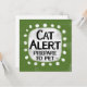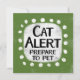 An irreverent and cute typographic animal design that says "Cat Alert, Prepare To Pet". It features black and red text on a white rectangle with funky, playful white dots surrounding it, all on a grey background.