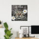 This beautiful poster print for cat lovers and cat owners features a photograph of a handsome fawn tabby cat with startling green eyes and cute tawny brown nose hiding out in the grass as he looks up speculatively at a tree with birds in it. On either side of the tom cat's face are daisy flowers.