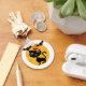A cat in a black witch hat sits with a bright harvest moon in the background as two bats fly around! Cats and Bats Halloween T-shirts, bodysuits, sweatshirts, mugs, magnets, buttons, trick or treat bags, cards, stickers, and other cute and colourful Halloween design apparel and gifts.