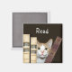 Orange and white tabby cat peers out from his library books with the advice to read square fridge magnet. Books png purchased from Painted on my Soul for use