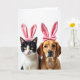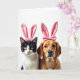 Designed with two cozy animal friends in mind, this card shows a sleek black-and-white cat and a caramel-colored dog sitting close together on a bright white background. The cat’s black coat contrasts with its white muzzle and chest, and its golden eyes glance sideways with a knowing look that feels gently affectionate. A rosy-pink headband with tall bunny ears rests on the cat’s head, adding a sweet Easter touch 🐰. Beside it, the dog’s warm coat and dark, soulful eyes face forward, and the slight tilt of its head reads like quiet loyalty toward its companion. The dog wears a matching pink headpiece finished with a neat bow, echoing the cat’s ears and tying the pair together 🐇. Near the top, a short Easter greeting appears in soft pink lettering, centered so it floats above their heads without crowding them. Bright, even lighting brings out the fur textures and the plush look of the pink accessories against the crisp white space.