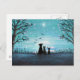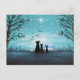 Two dogs and cat silhouette watching the sunset on a winter evening. In colours of blue, black and white. With two trees on both sides and birds flying towards the sunset. Snowflakes falling and a couple of bright stars in the sky. Winter scenery Original Acrylic Painting Art done by Donna Leger for Irony Designs. All Rights Reserved