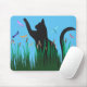 Cat silhouette in black with colourful dragonflies and cattail plants on a blue background.