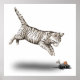 Cute cartoon of a white and brown stripped kitten leaping onto a windup toy mouse.