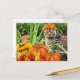 This Thanksgiving card was created from one of my collages. A variety of cutout illustrations were layered by hand onto my original photograph of a cat in the grass garden. All pumpkins, mice, hats, and crowns were also added as layers. The finished project is adorable and perfect for anyone who loves cats. All who receive this holiday postcard will smile.