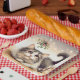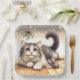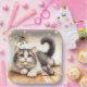 Watercolor fluffy cat with wide eyes lies on a wooden floor gazing up at the mistletoe hanging above with a mouse nearby