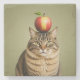 Funny cat with an apple balancing on top of his head.