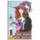 A cute red head witch all in purple with her black cat sitting on a stack of books. Potions, spider and candle in a backdrop of pink
