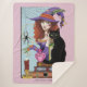 A cute red haired witch all in purple with her black cat sitting on a pile of books. Potions, spider and candle all in backdrop of pink