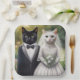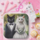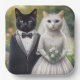 Two cats are dressed in wedding attire one in a tuxedo and the other in a bridal gown holding a bouquet