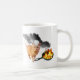 An orange cat wearing a chefs hat holds a flaming frying pan on this funny cooking mug.