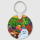 Keychain featuring Louis Wain’s animal painting Master of Cat College (1860-1939). A thoughtful white cat with striking blue eyes sits ponderously next to a vibrant assortment of beautiful flowers. The majestic cat college looms in the background underneath a pink and blue sky. A wonderful gift for cat lovers and English art.