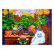 Photo Print featuring Louis Wain’s animal painting Master of Cat College (1860-1939). A thoughtful white cat with striking blue eyes sits ponderously next to a vibrant assortment of beautiful flowers. The majestic cat college looms in the background underneath a pink and blue sky. A wonderful gift for cat lovers and English art.