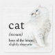 A dictionary definition for CAT in black text on a whitewashed wood background with a white Persian cat sketch