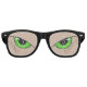 A green cat eye on each perforated flesh coloured 'lens' on black Wayfarer designer party frames.