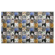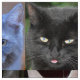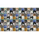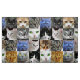 Cat faces collage fabric. Pictures of cats and kittens cover this material in squares. Large pattern of black, white, tabby, and tiger cats with green, yellow and orange eyes.