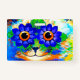 Badge featuring Louis Wain’s animal painting Cat Flower Eyes (1860-1939). A rainbow cat widely grins. Blue flowers cover his eyes. A wonderful gift for cat lovers and English art.
