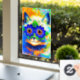 Window Cling featuring Louis Wain’s animal painting Cat Flower Eyes (1860-1939). A rainbow cat widely grins. Blue flowers cover his eyes. A wonderful gift for cat lovers and English art.