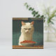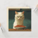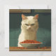The image depicts a white cat with a serious, almost displeased expression, staring intently at a full bowl of cat food in front of it. The background features dark green tiles, adding to the focused and slightly dramatic mood. The cat's fur is detailed, and its green eyes are narrowed, giving it a strong, commanding presence. The overall style is reminiscent of vector art, with clean lines and bold colours.