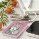 Keychain with a cute illustration of a girl with a cat hugging her head. Personalise this keychain with your name and your favourite colour (shown here on pink).