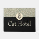 Cats treat our homes like hotels, coming and going just as they please, expecting breakfast and dinner on a plate and a nice comfy place to sleep. The door mat looks like a hotel sign with the name Cat Hotel in stylish cream lettering on a black panel. Above is a vintage black and white illustration by Louis Wain of a cat couple sitting on a wall, paws and tails wrapped around each other inside a cream circle shape. Across the top of the design is a pattern of little cream and brown cat's paw prints on soft grey. You can change the grey colour to suit with the customise button, also the name. The perfect door mat for feline loving friends and family.