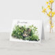 Watercolor design of a cute tabby cat in green foliage for getting older birthday humour.