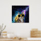 A cute image of a cat wearing yellow sunglasses overlaid on a colourful galaxy / universe; this gives the illusion that the cat is in outer space