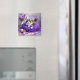 A magnet with a sweet kitty cat sitting on a ball of purple yarn and next to a purple vase of flowers.