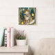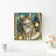 Wall clock with a design of a cat, with a tender look, in the forest, surrounded by fireflies. Cute, graceful, naive, childish drawing. Square image.