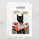 Black kitty cat peeks from behind a flower garden, contemporary, trendy colours, illustration of clouds, cat, flowers, leaves.