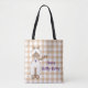 Tan and white gingham all over printed tote, with cute graphics of a cat. Purple text reads Here Kitty Kitty, and can be personalise to read what you want. Cute all purpose tote for any feline fancier.