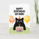 Happy Birthday cat mum card with little black cat, birthday cake and balloons.