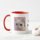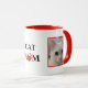 This cute, modern and unique design features two personalised cats' photos on both sides of the mug. The quote "Cat Mum" with a little hand-drawn red colour paw in the shape of a heart is featured in the centre of the mug. The modern and trendy typography makes the design fun, unique and special.