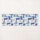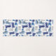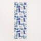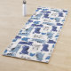 A yoga mat with a pattern of blue and grey cats on a white background, next to a white-water bottle, on a light wood floor. The cats are in various poses, such as lying down, stretching, and sitting. The pattern is dense and covers the entire mat. The water bottle is tall and cylindrical, with a black cap. The floor is made of light-coloured wood planks. The lighting is bright and even. The style is cartoonish.