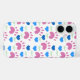Are you looking for a gift for the cat lover in your life? This phone case features a pattern of pink cat paws, blue hearts and green meows.