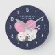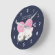 A clock with an adorable graphic illustration. A white kitty cat with a cute paw print image on her fur. Sleeping peacefully. A big pink heart behind her and some little stars too. Text says: Cat Person Lives Here. Dark blue background.