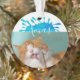 Cat Pet Photo Xmas Script Christmas Ornament. The design has a Xmas text in white script on a blue colour splash. Personalise the ornament with your cat or any pet photo and make a great holiday keepsake ornament or a unique gift. Also great with your family photo.