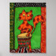 Decorate your walls in style with this unique, colorful folk art mini poster. In this colorful, whimsical artwork, this happy spotted cat stands on a patterned rug, playing his favorite African drum, the djembe. The entire scene is surrounded by a colorful border featuring tribal ethnic patterns. This mini poster would make a great gift for musicians, music teachers, or music lovers who also love cats.