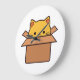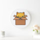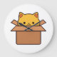 Playful cute and funny orange cat sitting inside cardboard box smiling